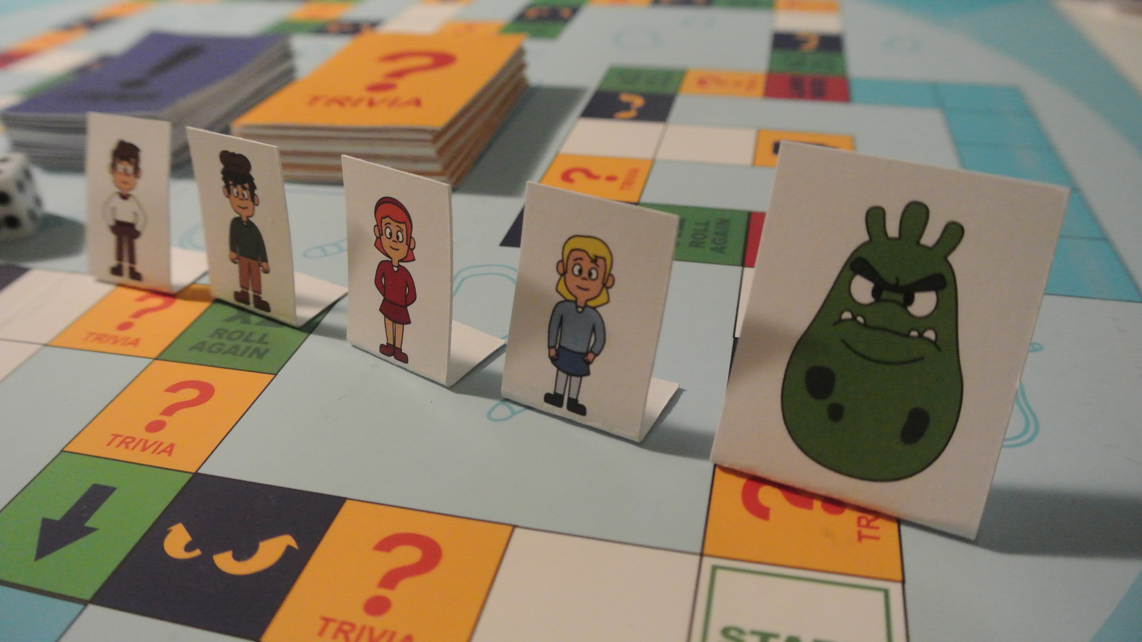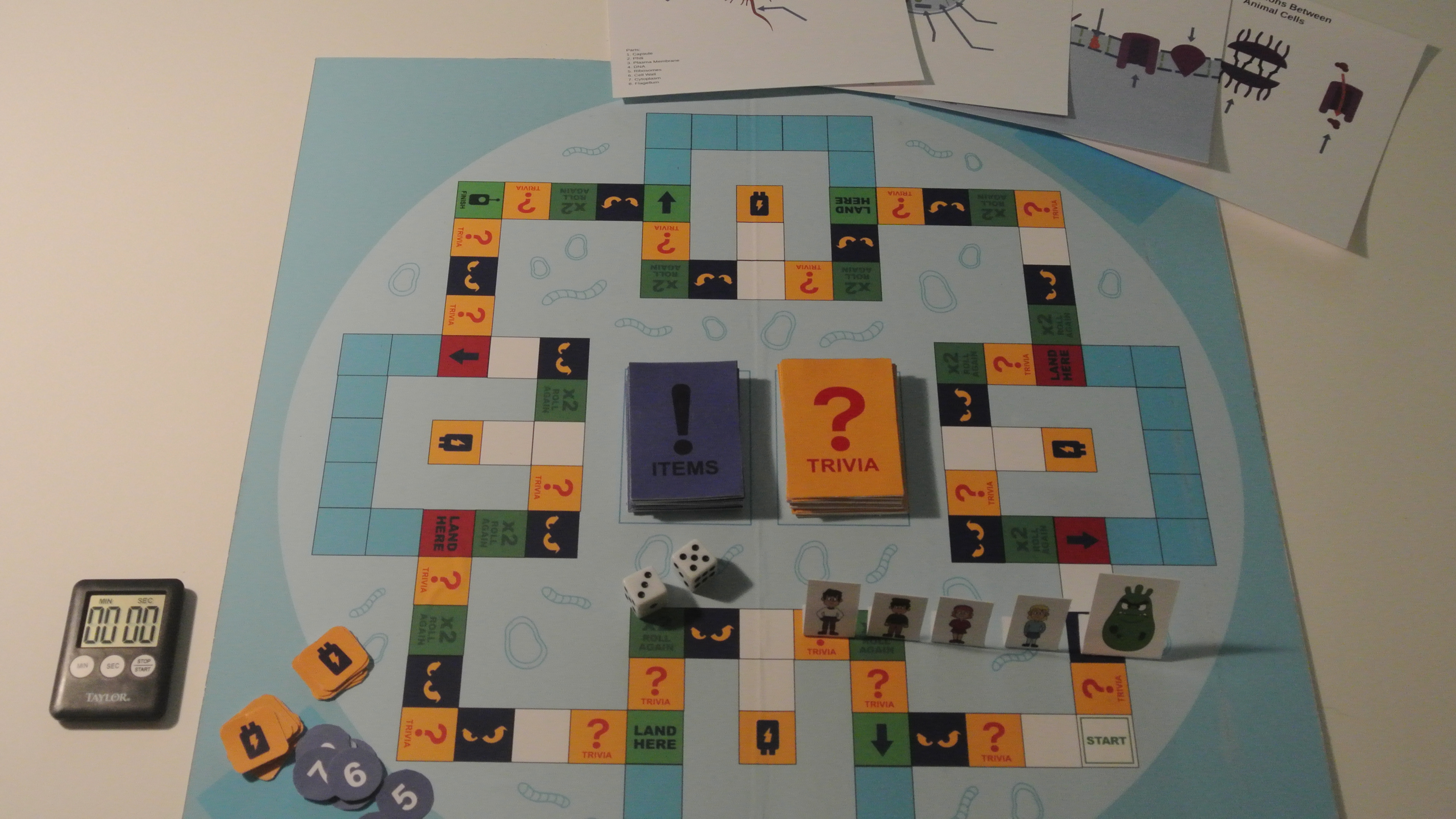 This board game allowed students to play as kids who were shrunk down by a remote they found in a lab and placed inside a container. Students had to go through the board, located inside the container, and find batteries for the remote so they could escape while avoiding a pathogen that would chase them. As they played, they learned about topics in Biology and how it affected them in their lives. This was done through trivia and activities that helped them define terms and learn more about cells in living organisms. Students were also allowed to use items that not only related to Biology, but also helped them progress through the game.